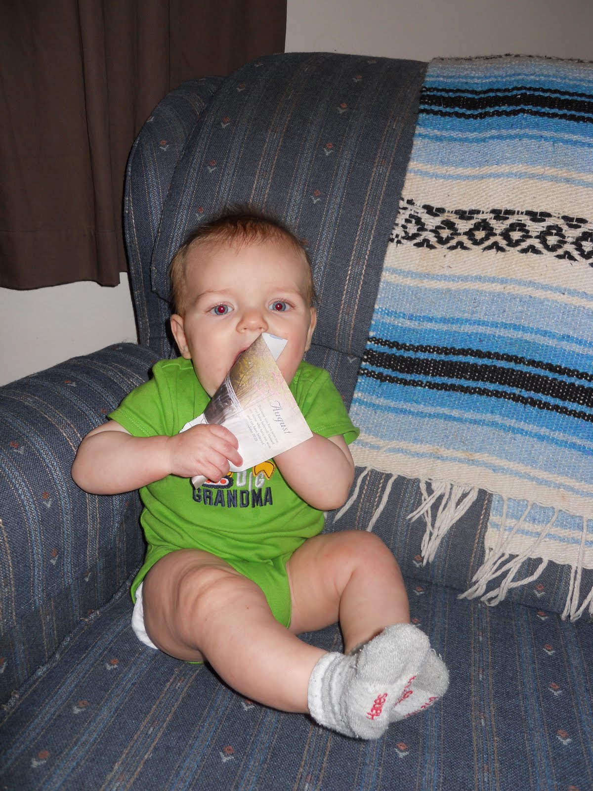 First try with the sippy cup. Not so much interested in drinking out of it as playing with it. Hmmm... probably should have put something besides water in it. We'll try again in a couple weeks.